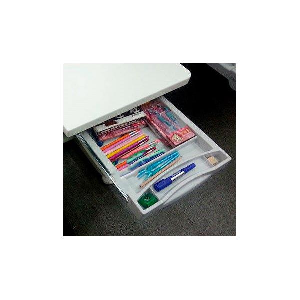 Справа, под неподвижной частью столешницы, расположен выдвижной органайзер. Благодаря этому все необходимые канцелярские принадлежности всегда находятся под рукой, не занимая места на рабочем столе. Сам ящик не мешает при работе, а на рабочем месте всегда поддерживается порядок.