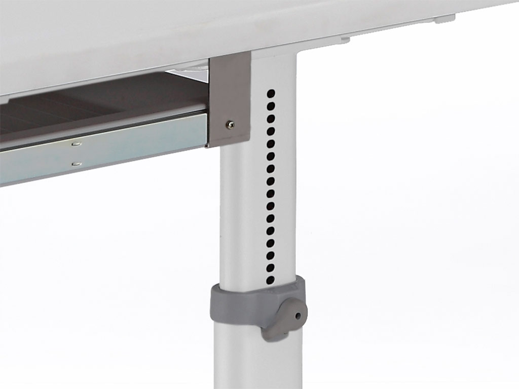 Высота парты легко регулируется с помощью механизма "Газлифт", предусмотренные фиксаторы на ножках придают парте дополнительную устойчивость. Также, ножки оснащены специальной регулировкой высоты для компенсации неровности пола.