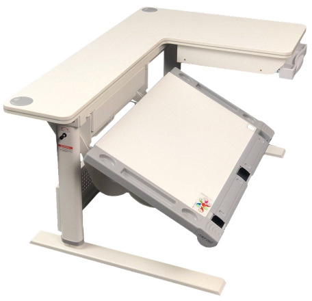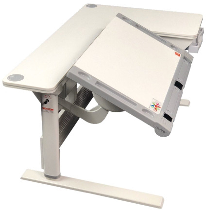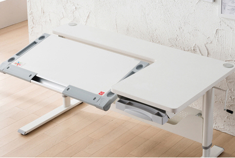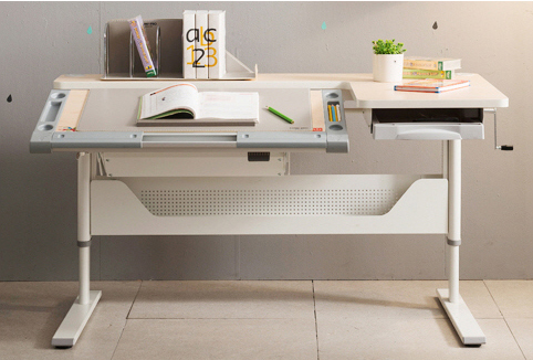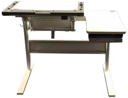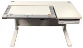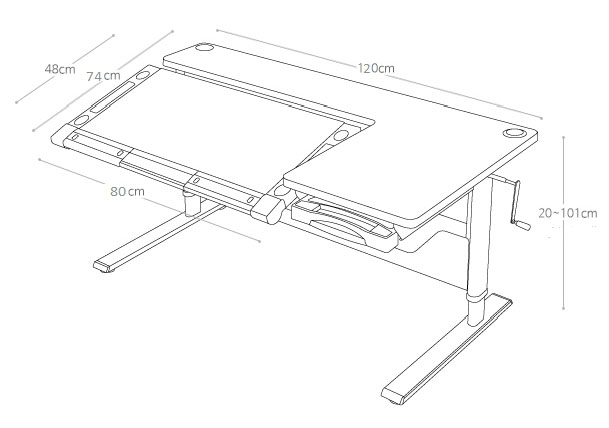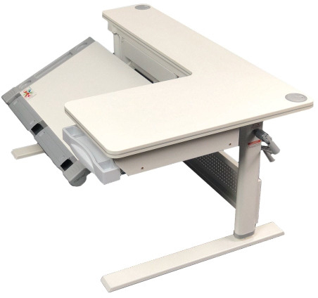 Выстота всего стола регулируется благодаря подъемному механизму, который приводится в движение ручкой сбоку под столешницей. А высота наклоняемой части столешницы регулируется отдельно немецким газ-лифтом STABILUS. Все это позволяет использовать стол как двух-трех летним детям , сидя на полу, так и взрослому человеку - стоя.