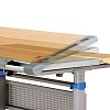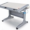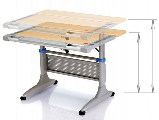 Подъёмный механизм данной модели оборудован системой «газлифт», чтобы малыш мог сам производить регулировку режимов. На поверхности столешницы созданы специальные углубления для размещения письменных принадлежностей и других школьных аксессуаров. Задняя полка-приставка сделана вровень с рабочей зоной, чтобы расширить её и создать удобные места хранения для учебников и тетрадей.