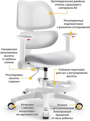 У кресла синхронная регулировка высоты спинки и глубины сидения, которая регулируется винтом. Плавную регулировку высоты кресла обеспечивает качественный газлифт. Возможность регулирования и наличие подставки позволяет использовать кресло со стандартными нерегулируемыми столами.