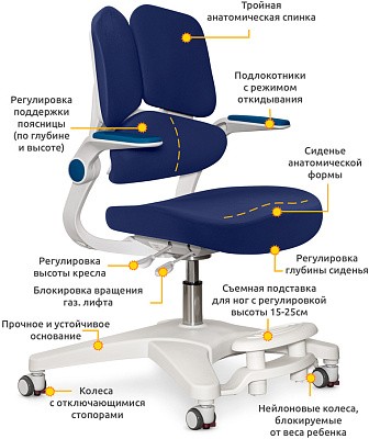 В конструкции кресла есть тройная спинка анатомической формы с регулируемой поддержкой поясницы, съемная подставка для ног с регулировкой высоты до 25 см., что позволяет использовать кресла с нерегулируемыми столами, откидывающиеся подлокотники, газлифт с возможностью блокировки и разблокировки вращения, колёсики с отключаемым автостопором .
