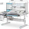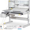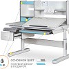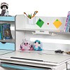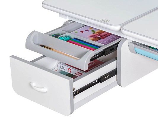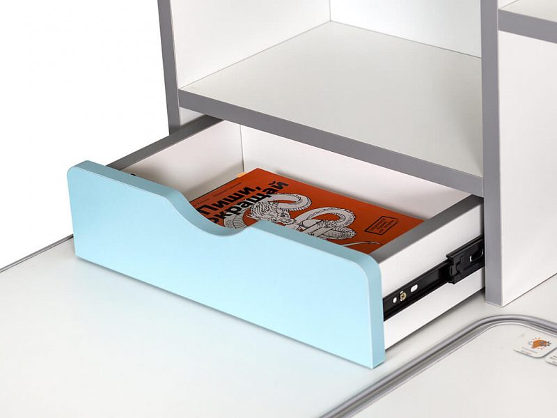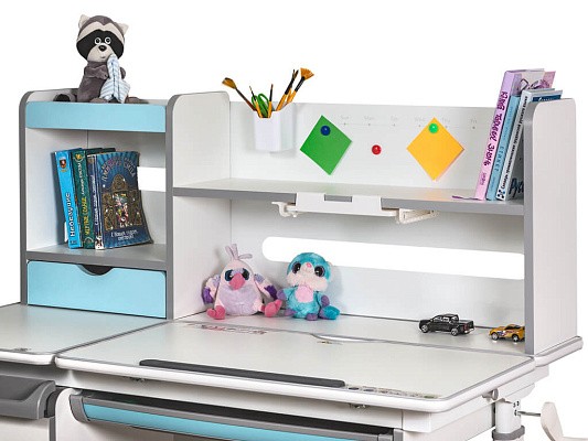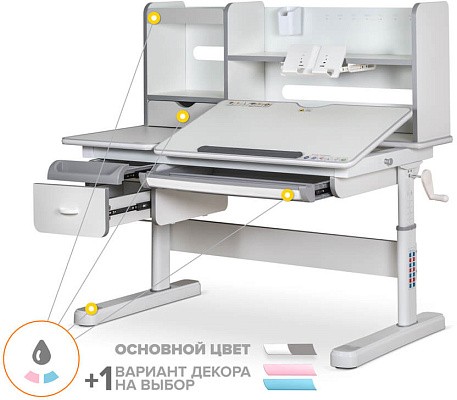 Важной особенностью данного стола является наличие сменных цветных накладок. Приобретайте стол серого цвета и получите на выбор голубые, либо розовые накладки. Накладки меняются на ножках, пластиковом выдвижном органайзере, выдвижном ящике и полочке на надстройке. Меняйте цвет декора в зависимости от настроения вашего ребенка!