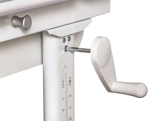 Высота стола регулируется с помощью червячного механизма ручкой. Как вы, так и ваш ребенок, сможете с легкостью отрегулировать стол, а благодаря шкале роста, изображенной на ножках, это будет сделать еще проще. Ручку можно разместить с любой стороны стола.