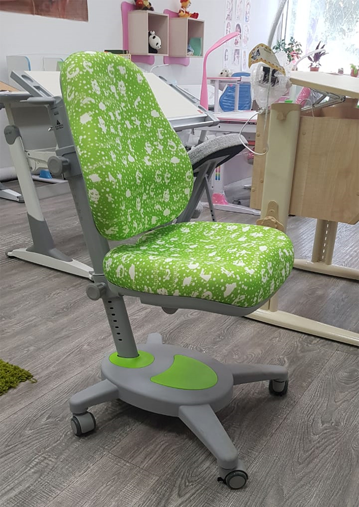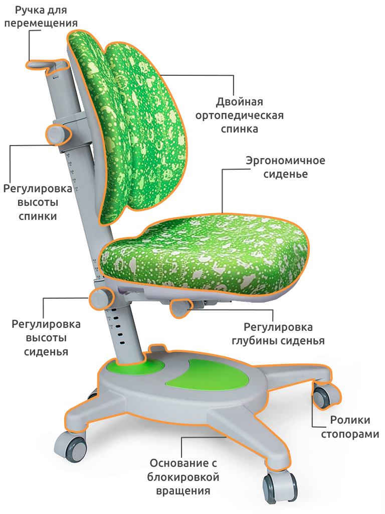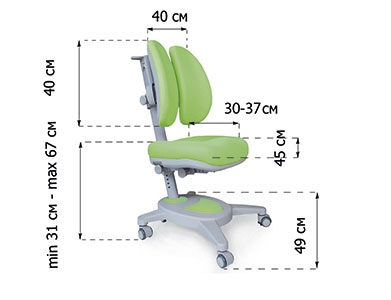 Сиденье кресла регулируется по высоте и глубине. Конструкция кресла разработана с учетом всех анатомических особенностей ребенка, также есть антисколиозная выемка, которая увеличивает глубину кресла для большего примыкания к спине ребенка и обеспечения поясничного упора.