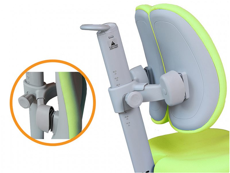 Спинка кресла регулируется по высоте, установленная высота надежно фиксируется специальным винтом. На несущей трубе есть ростовая разметка для того, чтобы отрегулировать высоту спинки в соответствии с ростом ребенка.