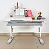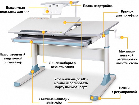 Подвижная часть столешницы меняет свой угол наклона с помощью специального газлифта. Одно плавное нажатие и вы трансформируете рабочую зону для письма и чтения, а благодаря большому углу наклона (до 60 градусов) столешницу можно использовать для рисования, как мольберт. Чтобы ребенок не травмировался, когда самостоятельно будет менять угол наклона, на столешнице есть безопасный зазор.
