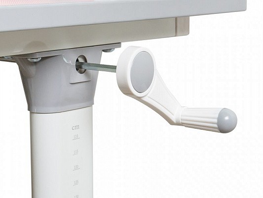 Высота всего стола плавно регулируется с помощью специальной механической ручки, которая расположена сбоку. Шкала соотношения роста ребенка, что изображена на ножках, поможет самостоятельно подобрать оптимальную высоту.