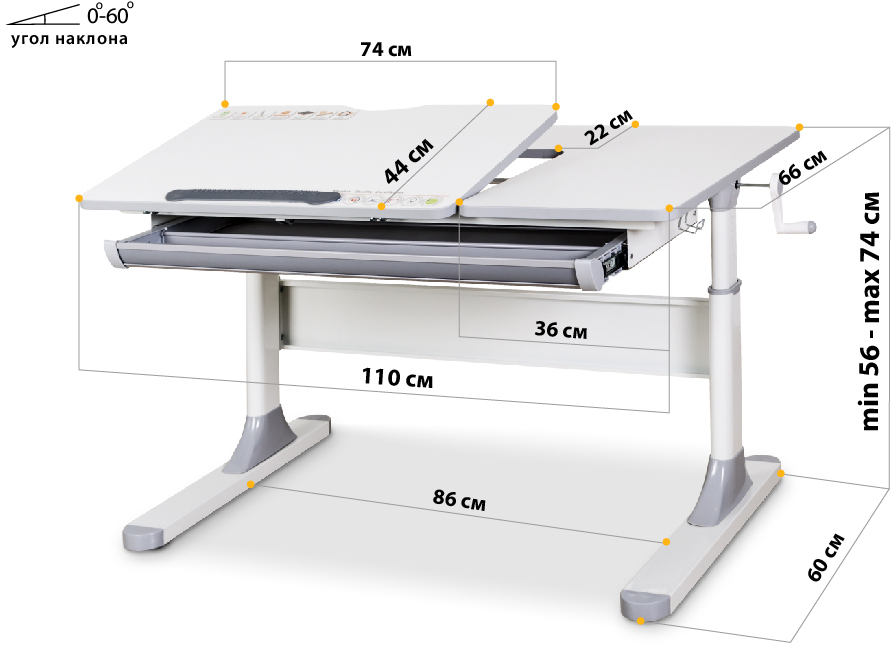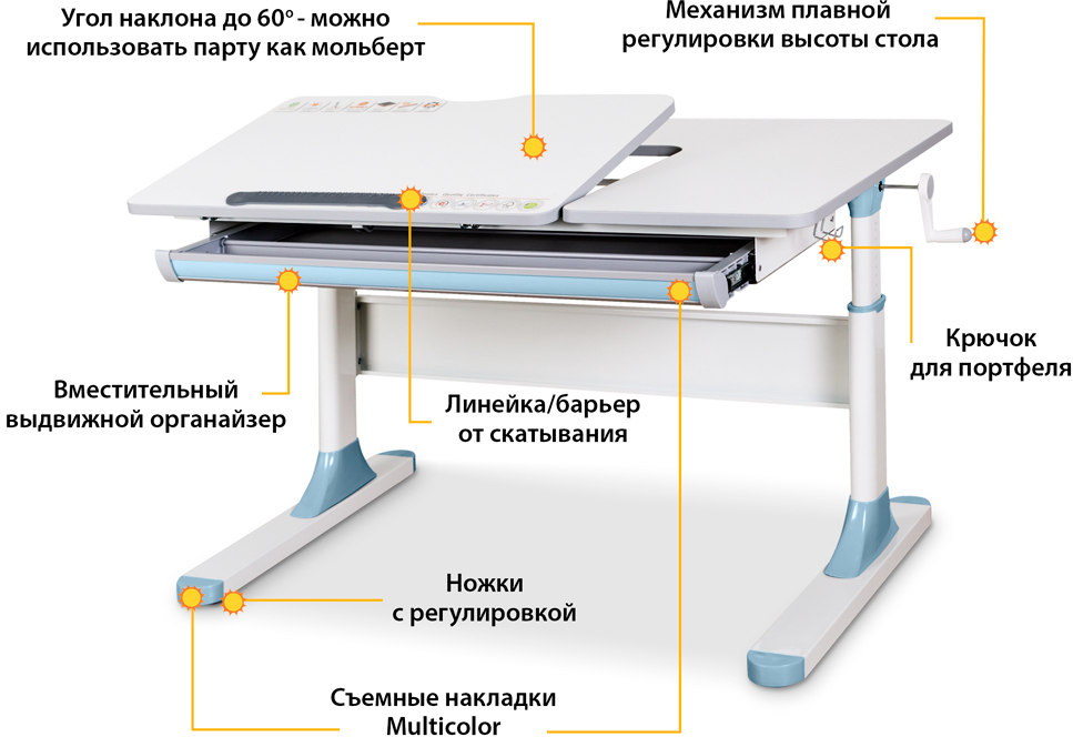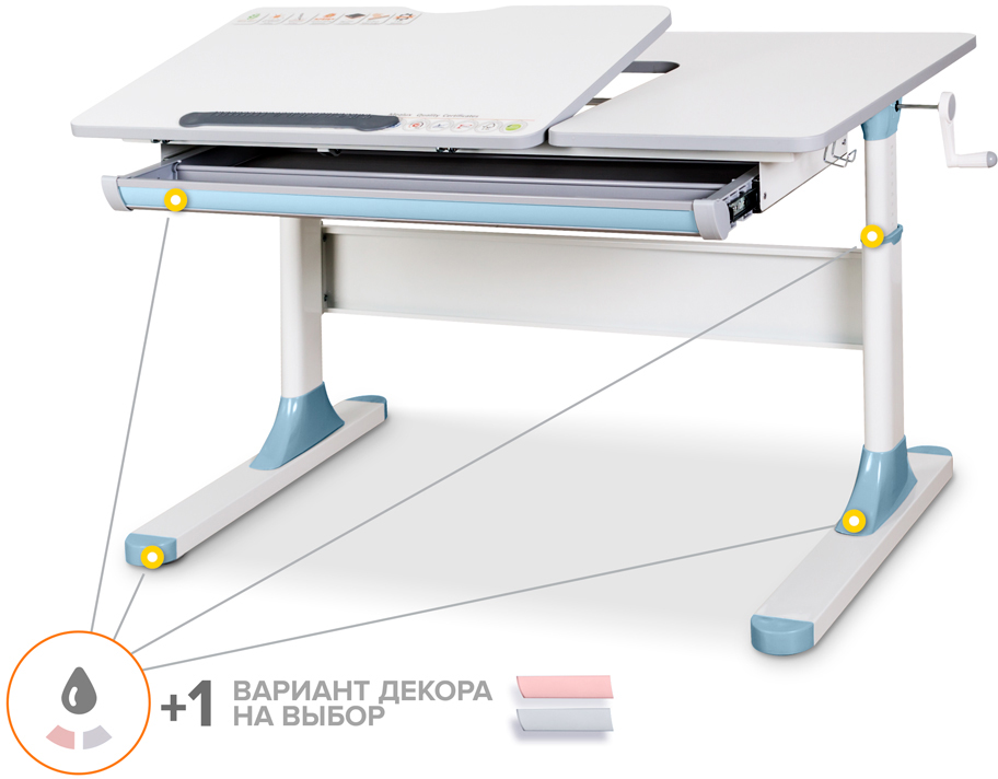 Подвижная часть столешницы меняет свой угол наклона с помощью специального газлифта. Одно плавное нажатие и вы трансформируете рабочую зону для письма и чтения, а благодаря большому углу наклона (до 60 градусов) столешницу можно использовать для рисования, как мольберт. Чтобы ребенок не травмировался, когда самостоятельно будет менять угол наклона, на столешнице есть безопасный зазор.