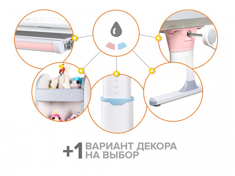 Важной особенностью данного стола является наличие сменных цветных накладок. Приобретайте полную комплектацию стола в сером цвете и получите розовые либо голубые накладки совершенно бесплатно! Накладки меняются на ножках и выдвижном органайзере.. Меняйте цвет в зависимости от настроения!