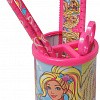 Набор настольный Mattel "Barbie" металлический, круглый. В наборе 4 предмета: 2 чернографитных карандаша, линейка, ножницы.