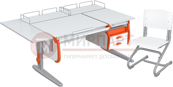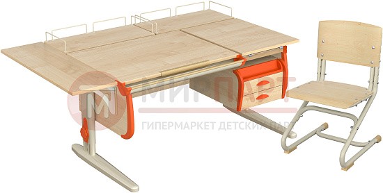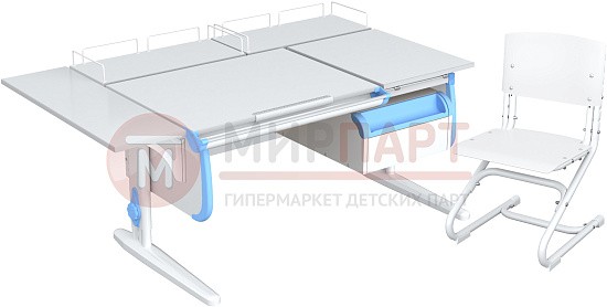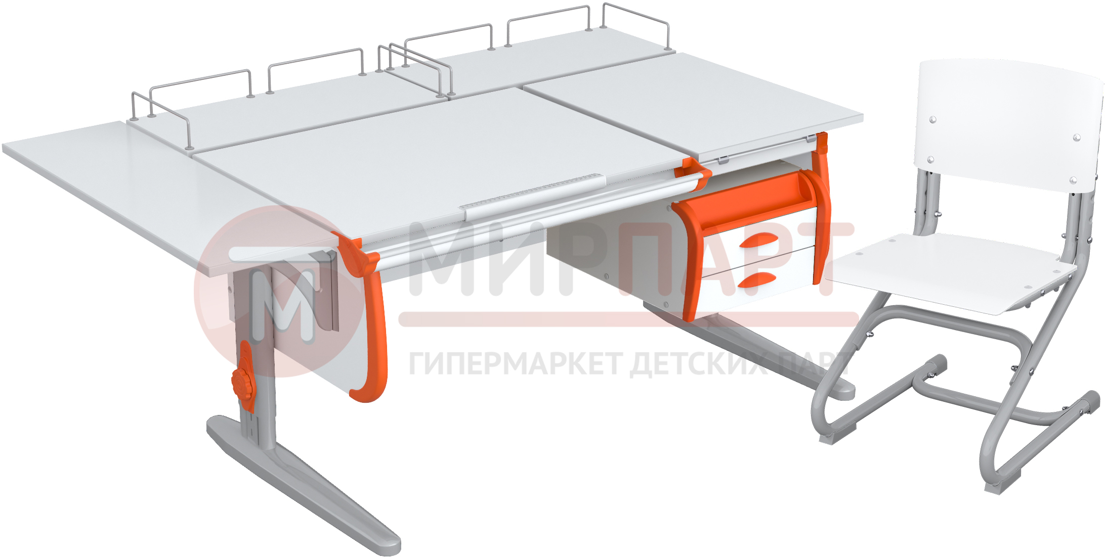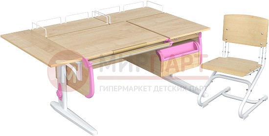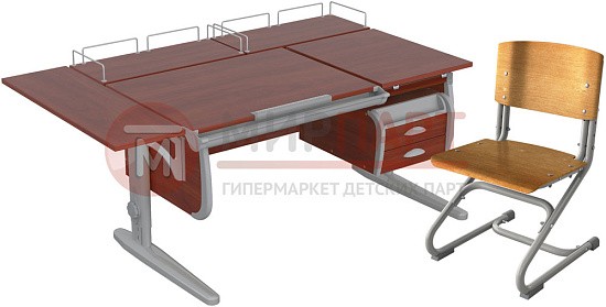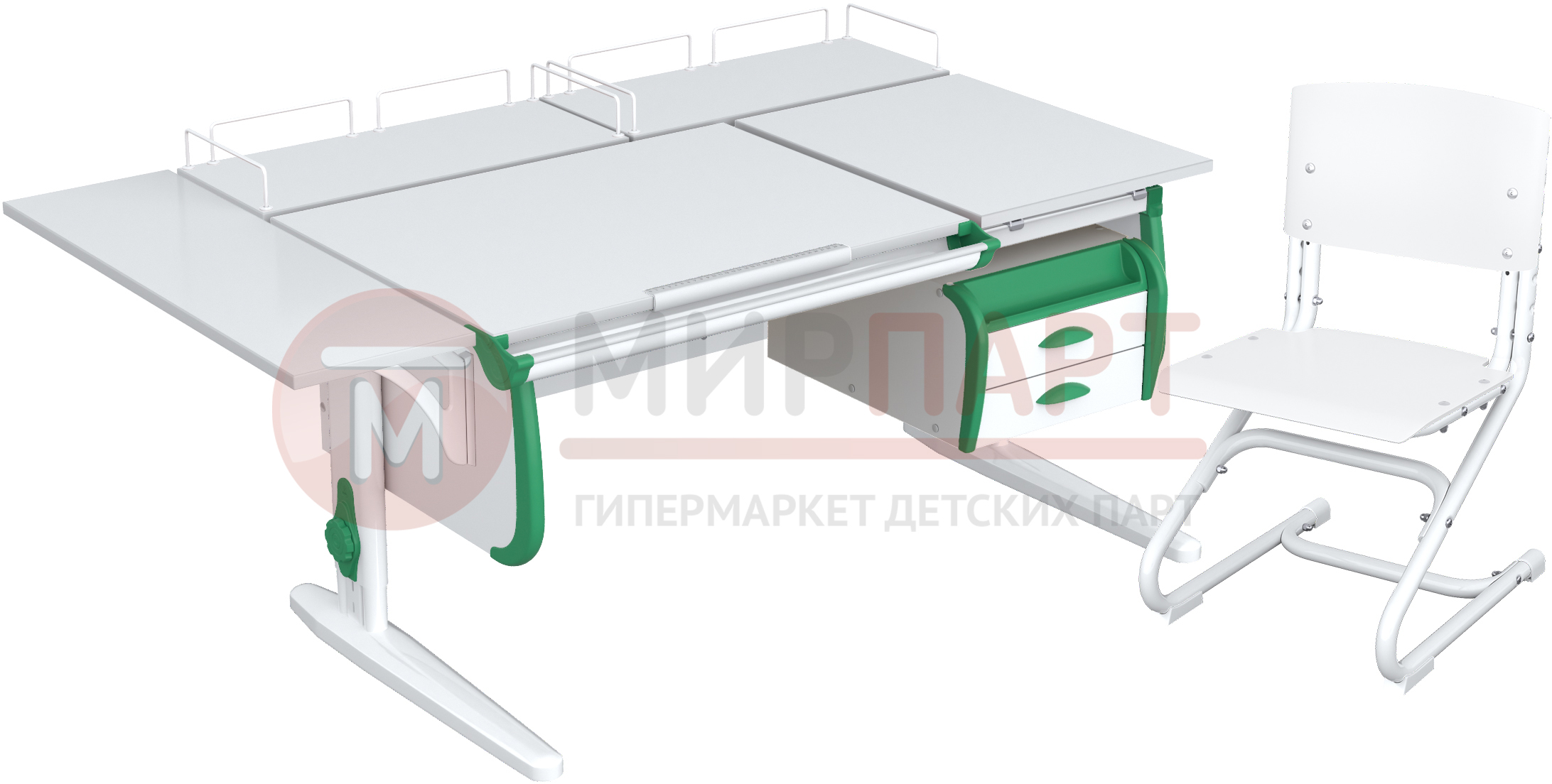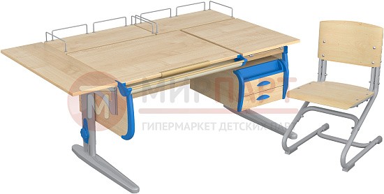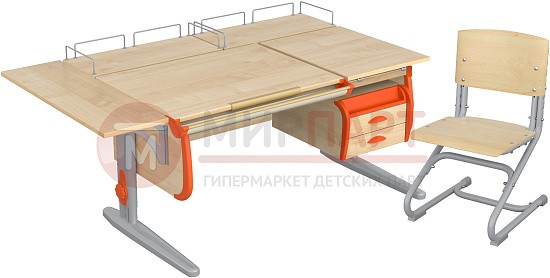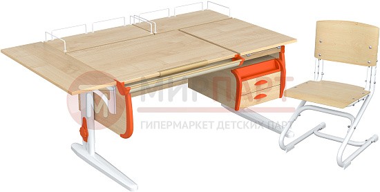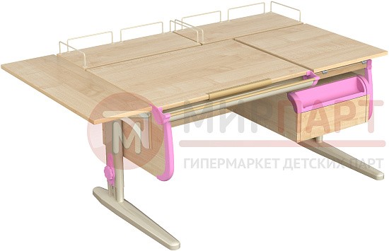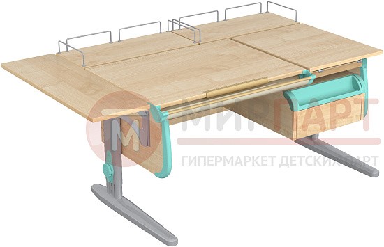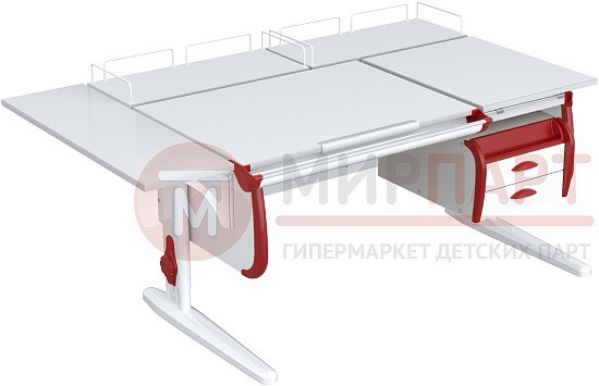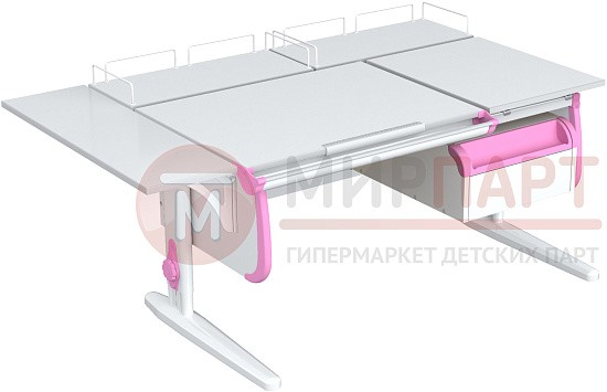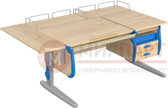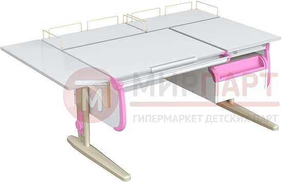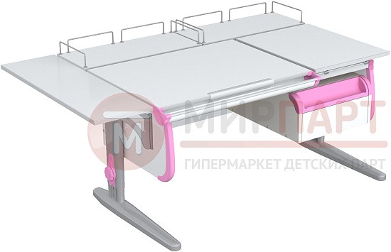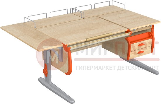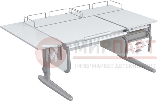 Функциональность парты также на высоте: раздельная столешница предоставляет возможность создания двух рабочих зон. Неподвижная часть отводится под хранение книг и учебников, в то время как угол наклона подвижной части легко может меняться, в зависимости от рода занятия ребенка – чтение, письмо, рисование или черчение. Тумбочка с двумя просторными ящиками и открытый пенал помогут школьнику разместить те вещи, которые не нужны постоянно, но должны оставаться под рукой. Две задние приставки плюс короткая боковая полочка завершают картину, создавая в итоге настоящий рабочий кабинет.