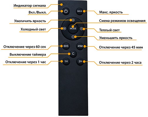 На плафоне размещены сенсорные кнопки управления работой лампы: включение/выключение, настройка цветовой температуры, регулировка яркости.